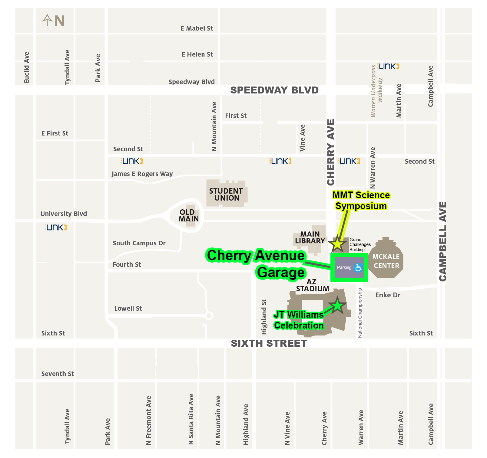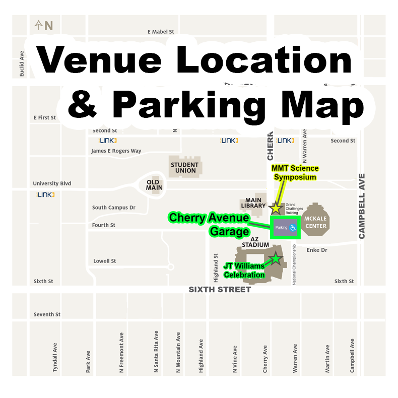 We recommend parking at the Cherry Avenue Garage, located north-east of the Arizona Stadium (football stadium). The Grand Challenges building (MMT Science Symposium) is located directly north of the Cherry Avenue Garage. The J.T. Williams memorial will be held at the Sands Club inside of the Arizona Stadium, south-west of the Cherry Avenue Garage.